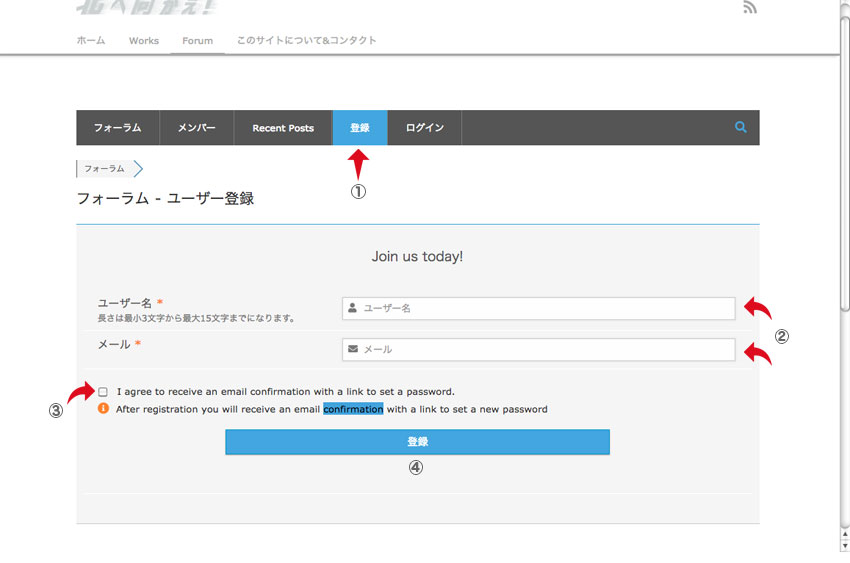 まずフォーラムページの「①登録」をクリックすると、下記の画像のような画面になります。