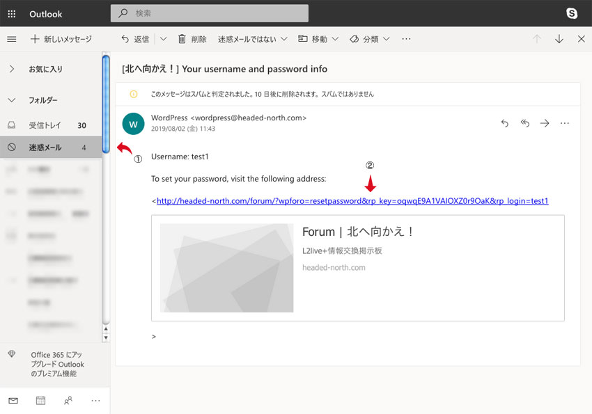 通常のメールフォルダーにない場合は、迷惑フォルダーを確認することをオススメします。
